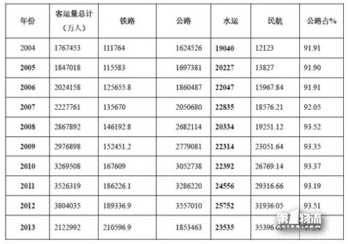 根据国家统计局解释,2013年公路水路客货运输数据源自2013年交通运输业经济统计专项调查,统计范围口径有所调整。按可比口径计算,2013年公路客运量、旅客周转量比上年分别增长4.2%、1.0%;水运客运量、旅客周转量比上年分别增长3.0%、2.9%。 也就是说,最近10年,公路客运量一直呈增长态势。