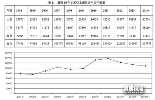 三是,5米以上座位客车销量已倒退5年,与国家经济发展的大环境不匹配。国家宏观经济增速虽有所放缓,但仍然保持高增长态势,2014年公路客车销量仅仅与2009年相当,在国家经济不断发展的大环境之下,这种倒退显得有些不合时宜。