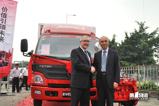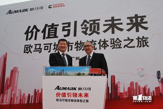 欧马可事业本部副本部长、营销公司经理李智与北京福田康明斯工厂厂长DES共同为欧马可快递物流订制新品揭幕