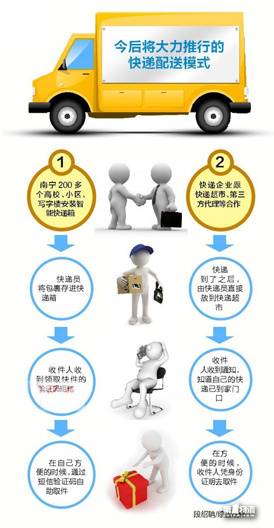 目前,南宁市已有200多个高校、小区、写字楼等安装了智能快递箱。快递员把包裹存进快递箱,收件人就会收到领取快件的验证码短信,可选择自己方便的时间自助取件。而对于乡镇等快递量相对少、投递成本较高的区域,南宁市正在部分乡镇开展“快递超市”试点,一家快递超市可服务多家快递企业,由一两家实力较强的快递企业对该片区的
