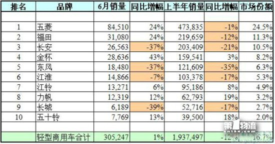 6月销量12,319辆,同比增长12%;上半年销量62,793辆,同比增长19%;市场份额3.2%。力帆是上半年增速最高的商用车品牌。