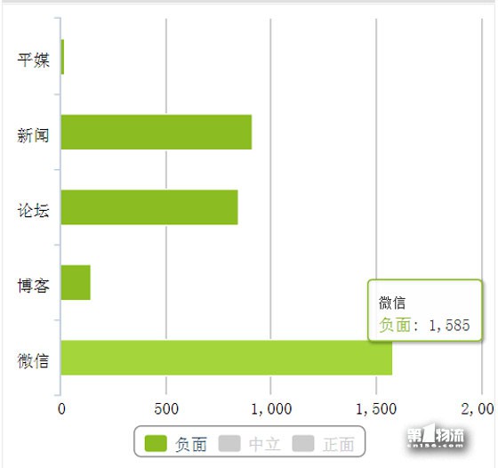 从负面舆情来源方面来看,微信负面信息最多为1585条,其次为新闻、论坛。