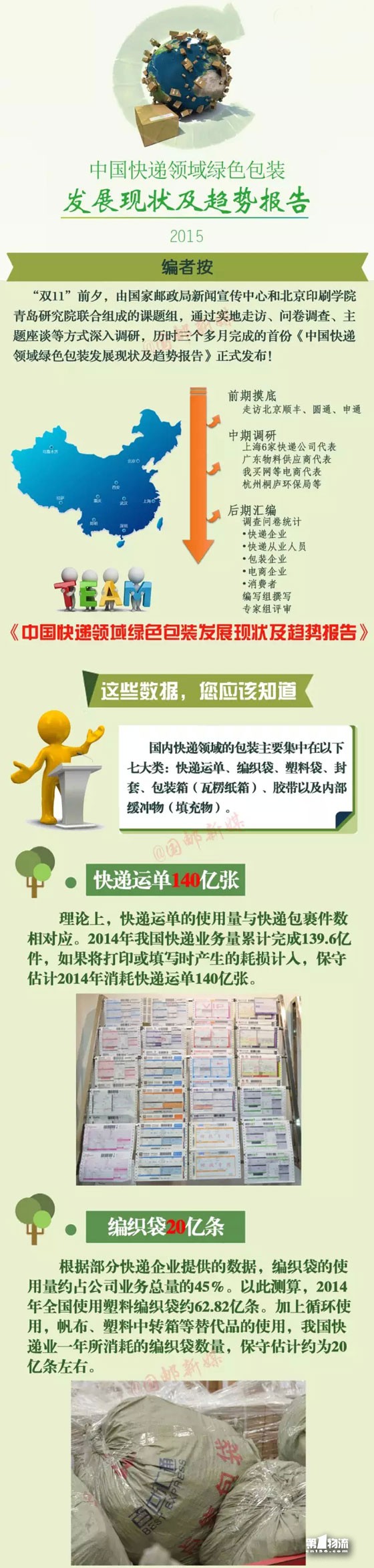由国家邮政局新闻宣传中心和北京印刷学院青岛研究院联合完成的《中国快递领域绿色包装发展现状及趋势报告》(以下简称“报告”),在“双11”期间,通过国家邮政局官方权威媒体《中国邮政快递报》、《快递杂志》等渠道正式发布。