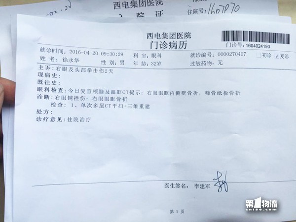 事后,小徐被同事送进医院,对伤口进行了清理和缝合。而第二天小徐表示头晕,在医院做进一步检查时被诊断为:右眼眼眶骨折,建议住院治疗。