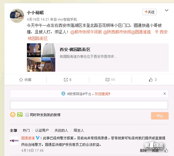 快递小哥被掌掴事件还未平息,4月19日下午,网友“小小萌昭”发布了一条西安圆通快递小哥被打的微博。该条微博称:“今天下午1点左右西安市莲湖区丰登北路百花明珠小区门口,圆通快递小哥被撞,且被人打,求证人!”