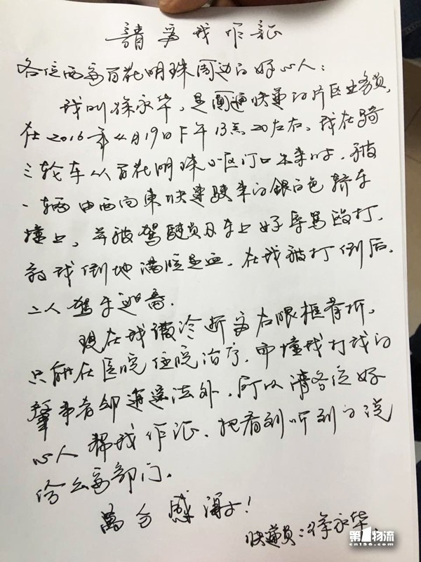 快递员小徐说:我现在在医院住院治疗,而撞我打我的肇事者却逍遥法外,所以请各位好心人帮我作证,把看到听到的说给公安部门。