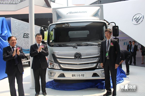 欧马可EST超级卡车在北京国际汽车展览会全球首发,福田汽车集团欧马可业务总监 欧马可事业本部本部长顾德华、福田康明斯发动机有限公司总经理关章华和中国物流与采购联合会副会长贺登才共同为欧马可EST超级卡车揭幕
