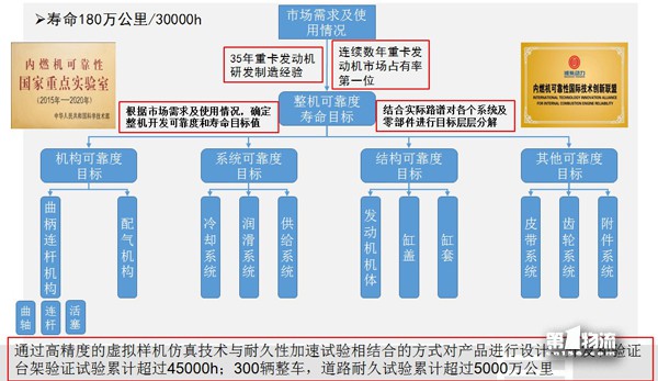 WP9H/WP10H作为潍柴全新开发、具有国际领先技术水平的新一代柴油机,在设计之初就把产品的可靠性放在第一位。依托代表中国内燃机可靠性研发制造最高水平的内燃机可靠性国家重点实验室,潍柴研发工程师根据市场需求及用户使用情况,确定整机开发可靠度和寿命目标值,通过高精度的虚拟样机仿真技术与耐久性加速试验相结合的方式对产品进行设计、开发和验证,台架验证试验累计超过45000小时;300辆整车,道路耐久试验累计超过5000万公里!最终实现寿命180万公里/3万小时,树立起高速重型发动机寿命的最高标准。