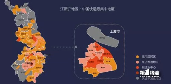 江浙沪地区是中国快递最集中地区,但非常明显的地方在于,经济相对欠发达的地区:浙西南、苏北、上海崇明等,同样也是快递不发达地区,而制造业中心与快递发出量大区几乎是重合的,经济发达地区的快递业务量更大。