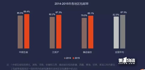 从上图数据可以看到,全国各地的包邮率最高的竟然是中部5省,达到89.4%,高出江浙沪地区2点多个点。
