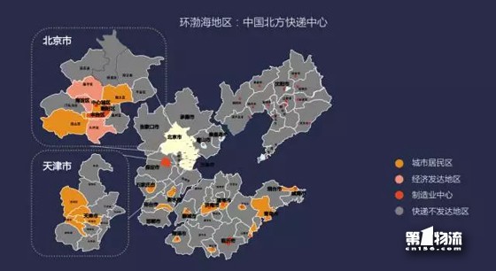 环渤海地区是比较特殊的经济圈,其快递收发量集中地区较为分散,虽然北京及其周边与上述情况相同,但也能发现不少经济情况与一线城市不在一个重量级的二三线城市也出现了快递量的集中。以邢台市为例,其本身经济状况无法与北上广深相提并论,但因为邢台市存在羊毛衫批发市场,因此也出现了某一地区巨大的快递收发。