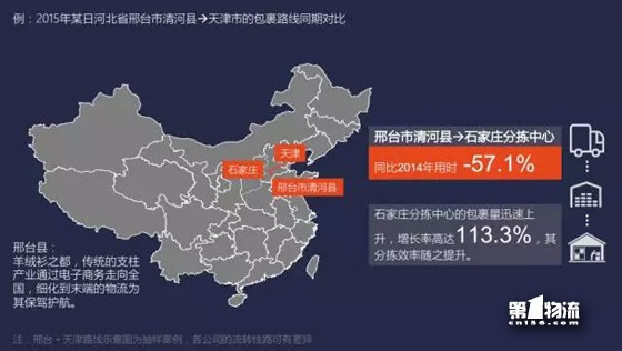 而二三线城市的快递服务基础设施建设,正在随着包裹量的增长显著改善,因此两座城市间的长途运输时间会有非常大的提升,因此,以邢台市清河县到天津为例,其中的中转线路时效提升明显,到达石家庄分拣中心,相比2014年提升了57.1%的时效。