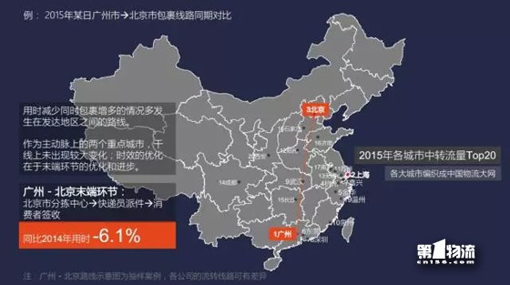 以广州发往北京为例,因为两座城市之间的基础设施建设已经非常完善,长距离运输时间已经没有提升空间,就像杨钦所说,更多的提升空间体现在末端配送上,2015年,广州发往北京的