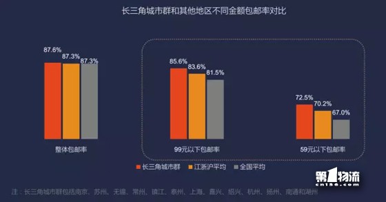 答案在这里。虽然整体包邮率全国水平差不多,但在99元以下包邮率与59元以下包邮率方面,江浙沪尤其是长三角城市群的小伙伴们简直幸福感爆棚。99元以下包邮率,江浙沪高出全国2个百分点,59元以下包邮,长三角城市群高出全国5.5个百分点。