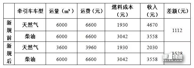 ① 新规后,燃气车收入降五成。新规实行前,燃气牵引车每车可运输约6000m?天然气,即每车运费收入约为6600元,扣除燃料成本1930元后,每车每次运输可获得收入4670元;而新规施行后,燃气牵引车每车只能运输约3600m?天然气,运费收入降至3960元,扣除相同燃料成本后,每车每次运输可获得的收入降为2030元,与之前相差2640元。