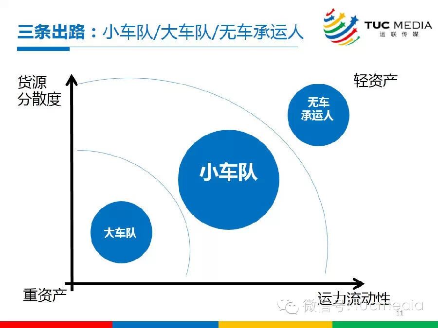 根据不同的市场需求和资产分布,我们认为,未来卡车司机将有三个选择:第一,加入大车队;第二,傍上无车承运人;第三,成为小车队。