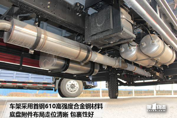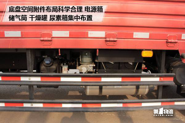 车辆按照法规需求,四周均配有防钻入被动安全装置。在车身附件方面,左侧装配有200L铝合金油箱,轻量化同时耐腐蚀,右侧科学布置有电源箱、储气筒、干燥罐、尿素箱等附件,管理维护方便。