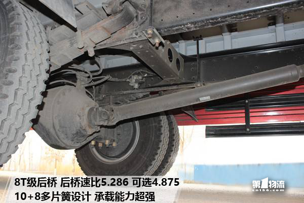 承载方面,前桥承载达到3.2T,后桥采用8吨级后桥,速比4.875。悬架采用前8后10+8片钢板弹簧布置,满足标载需求。配合上9.00R20的全钢丝子午线轮胎,用户反馈对于他们这种相对路况较好的运输,希望能够选配真空胎。