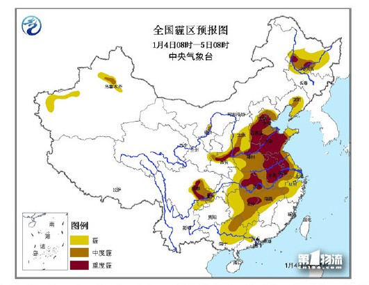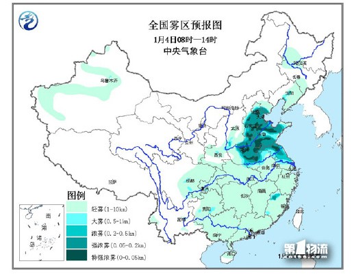 中央气象台1月3日晚发布大雾红色预警,同时继续发布霾橙色预警。4日6时,中央气象台继续发布大雾红色预警,预计4日08时至5日08时,北京中南部、天津、河北中南部、河南中东部、山东大部、安徽北部、江苏大部、山西西南部等地有大雾,其中,北京南部、天津、河北中南部、河南东部、山东中西部、江苏中北部等地有能见度低于200米的浓雾,部分地区有能见度低于50米的特强浓雾。