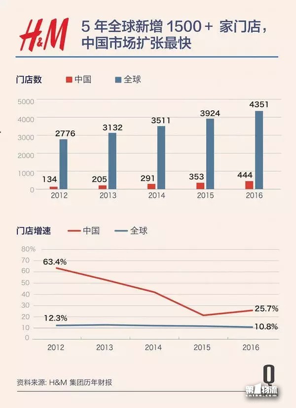 在2012年至2016年的五年里,全球门店总数由2776家增长到4351家,涉足的市场数量由48个扩张到64个,员工人数从7.2万补充到11.4万;仅在中国,2016财年就净增91家门店,平均每4天开出一家新店……