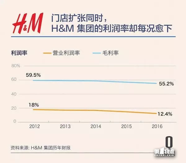 过去一年,H&M的毛利率已从2012年的59.5%下滑到了55.2%,营业利润率则从18.01%降低到了12.4%。