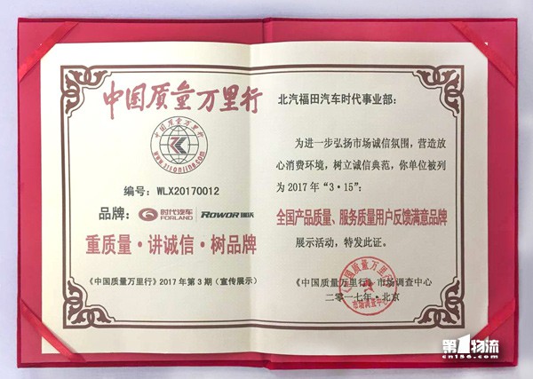 近日,福田汽车时代事业部获得由《中国质量万里行》市场调查中心颁发的2017年“3·15”“全国产品质量、服务质量用户反馈满意品牌”荣誉证书。