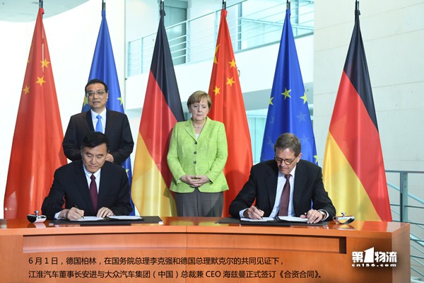 6月1日,在国务院总理李克强和德国总理默克尔(Angela Merkel)的共同见证下,安徽江淮汽车集团股份有限公司(以下简称江淮汽车)与大众汽车集团于德国柏林正式签署合资企业协议。该协议的签署标志着中德两国合作新的里程碑。根据该协议,合作双方将共同成立一家股比各占50%的合资企业,进行新能源汽车的研发、生产和销售并提供相关移动出行服务。