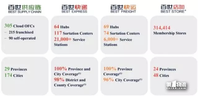 ③ 百世快运:百世快运的数据,共拥有69个中心站点,74个分拣中心,6000多个服务网点,覆盖全国所有省份,覆盖96%的城市。根据文件,截止2017年6月30日,在其平台上注册的运输服务供应商和代理商已经超过1900家,共拥有卡车11万。