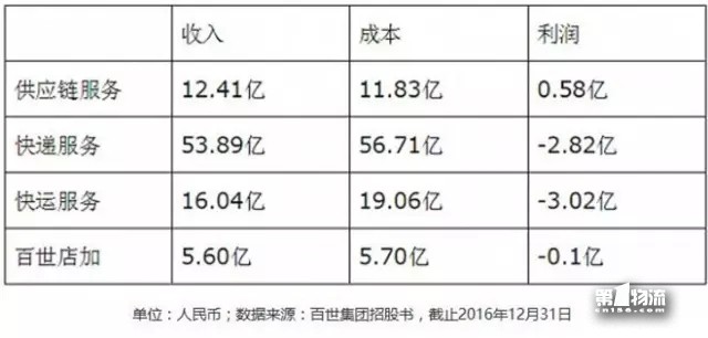 ② 唯有供应链业务盈利。而从另一张图中可以看到,除了优势板块供应链业务有盈利,其他快递、快运和店加业务都在2016年亏损。