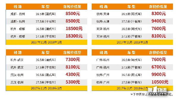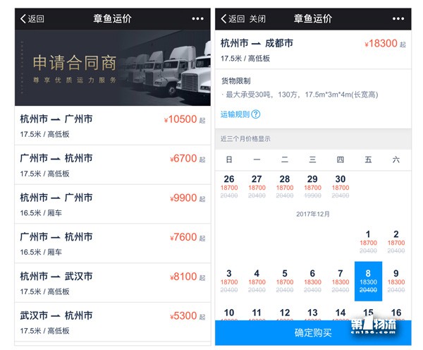 “经过测算,章鱼运价预定未来运力的方式与传统找车方式相比,能让运力需求方的物流成本降低8%以上,同时还能让无序、临时的运输安排变得更有计划。”据悉,目前,章鱼运价已重点推出杭州至成都、杭州至天津、杭州至武汉、杭州至广州四条往返线路,欲打造爆款线路,上线首月运价优惠幅度巨大,16.5米厢车整车运输含税标准运价低至4300元,所有线路价格优惠幅度在1500元—2500元不等。