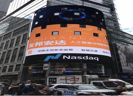 纽约时代广场,又被称为“世界的十字路口”,许多国际知名的公司总部以及著名的纳斯达克证券交易所都设立在此。2018年5月友邦安达登上了纳斯达克证券交易所的大屏,使中国智能交通领域的科技公司首次出现在了世界人民的眼前。
