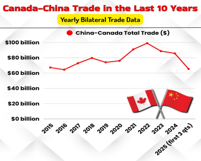 2024年,加拿大与中国的双边贸易总额为1187亿加元(846.5亿美元),仅次于与美国的9244亿加元。卡尼推行务实的政治经济政策,认为对华贸易潜力巨大,可以弥补因关税和其他贸易壁垒造成的对美贸易损失。