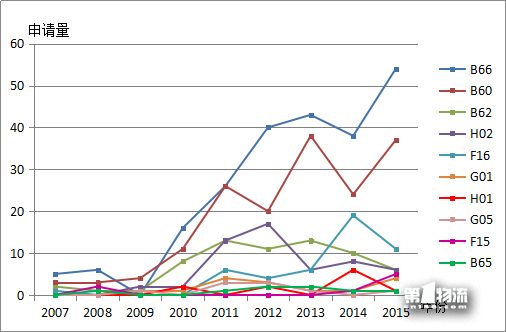 2014年—2015年期间,B66(卷扬;提升;牵引)、B60(一般车辆)和F16(工程原件或配件;为生产和保持机器或设备的有效运行的一般设施;一般绝热)领域专利申请量总体上处于曲折增加的态势,说明这三块技术领域还未发展成熟,未来还会继续突破;2009年,B62(无轨路用车辆)领域专利申请量迅速增加,但近几年一直保持平稳的趋势发展,2013年甚至呈现下降趋势,说明此技术领域已经发展成熟,未来技术专利方面可能不会再有新的突破;2010年,H02(发电;变电或配电)领域的申请量迅速增加,2012年达到最大值后逐年递减,说明此技术领域在2012年的时候已经发展地较为成熟,此后可能出现了技术转移的情况;H01(基本电器元件)、B65(输送;包装;储存;搬运薄的或细丝状材料)、F15(流体压力执行机构;一般液压技术和气动技术)和G01(测量;测试)的专利申请数量一直保持较低的水平,具体如图3所示。