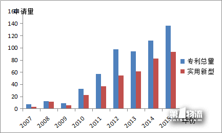 从专利申请数量的角度分析,2007—2015年专利申请总量在逐年上升,说明电动叉车技术已经成为持续关注的热点技术问题,具体如图2所示。