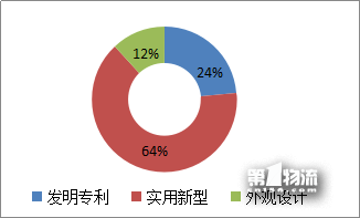 截止2016年3月31日,以“电动叉车”为关键词,在中国知识产权网站上进行检索,共检索到615条专利,其中实用新型专利占比最大,具体各类型比例如图1所示。