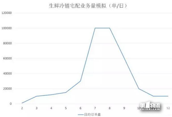 冷链物流服务需求的最高峰,而9月、10月因为是“鲜收”的高峰,比如大闸蟹等。所以尽管这个时候,天气已经开始普遍转凉,但是生鲜的冷链需求还是有的。到了11月份天气转凉,各企业基于成本的考量,都纷纷把生鲜产品改用“普件”方式进行配送,因此生鲜的订单量急剧下滑。在低谷运行需要一直持续到次年5月份,只有到了6月份,随着天气开始变热业务量才会好转。当然,是不是高峰和低谷的差异就一定这么大,具体的数据各冷链宅配物流公司才有深刻的体会。