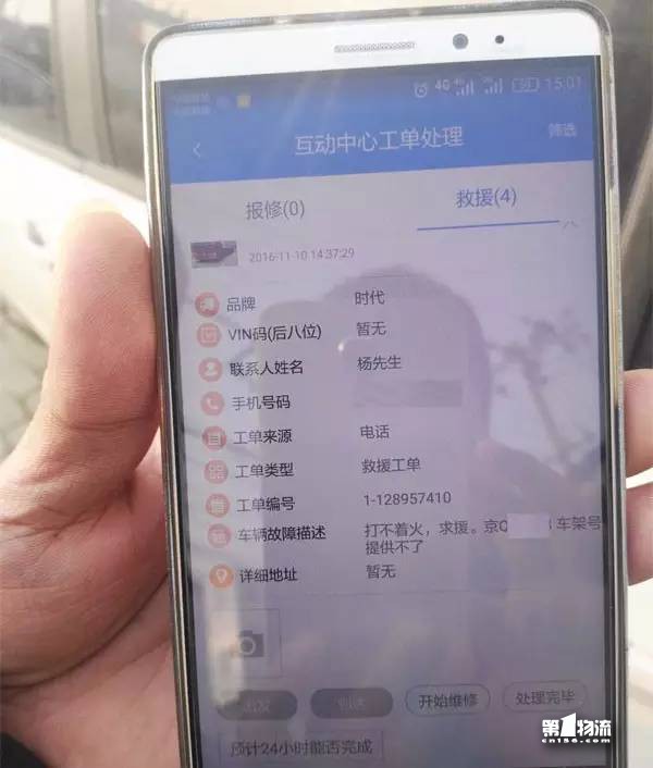 14:30,中通快递大红门店门口,记者以用户的身份拨打了福田时代的400电话,厂家客服人员瞬间接通电话后,仔细询问了用户姓名、故障信息、底盘号、车牌号、车型、购车日期、车辆所在位置等,这一系列问答展现了福田时代客服人员的专业素养。紧接着,客服人员告诉记者,请不要着急,马上安排服务站人员进行沟通,15分钟内会有维修人员打来电话。
