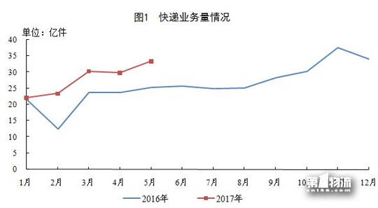 5月,全国快递服务企业业务量完成33.4亿件,同比增长32%;业务收入完成407.4亿元,同比增长28.7%。