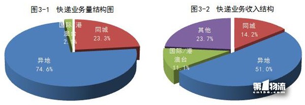 1-5月,同城、异地、国际/港澳台快递业务量分别占全部快递业务量的23.3%、74.6%和2.1%;业务收入分别占全部快递收入的14.2%、51%和11.1%。与去年同期相比,同城快递业务量的比重下降1.2个百分点,异地快递业务量的比重上升1.3个百分点,国际/港澳台业务量的比重下降0.1个百分点。