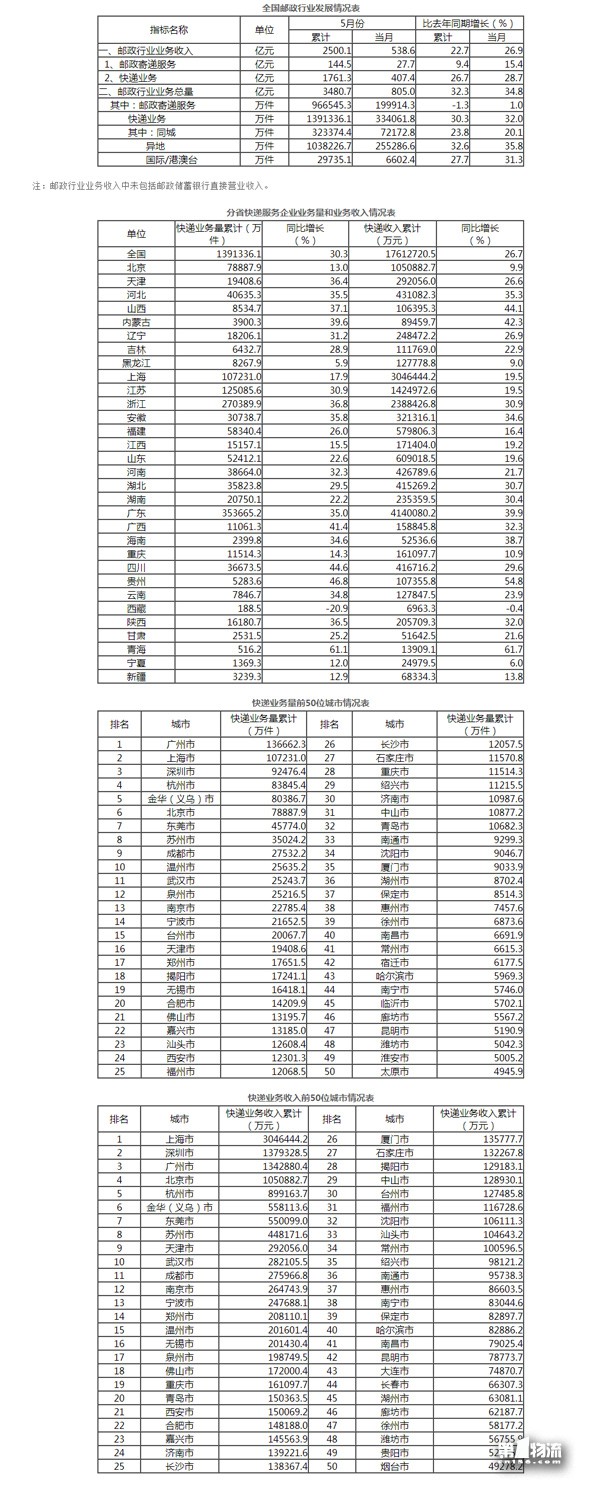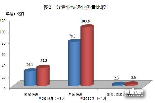1-5月,全国快递服务企业业务量累计完成139.1亿件,同比增长30.3%;业务收入累计完成1761.3亿元,同比增长26.7%。其中,同城业务量累计完成32.3亿件,同比增长23.8%;异地业务量累计完成103.8亿件,同比增长32.6%;国际/港澳台业务量累计完成3亿件,同比增长27.7%。