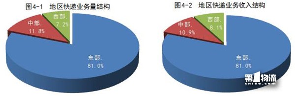 1-5月,东、中、西部地区快递业务量比重分别为81%、11.8%和7.2%,业务收入比重分别为81%、10.9%和8.1%。与去年同期相比,东部地区快递业务量比重基本持平,快递业务收入比重下降了0.1个百分点;中部地区快递业务量比重下降了0.3个百分点,快递业务收入比重基本持平;西部地区快递业务量比重上升了0.3个百分点,快递业务收入比重上升了0.1个百分点。