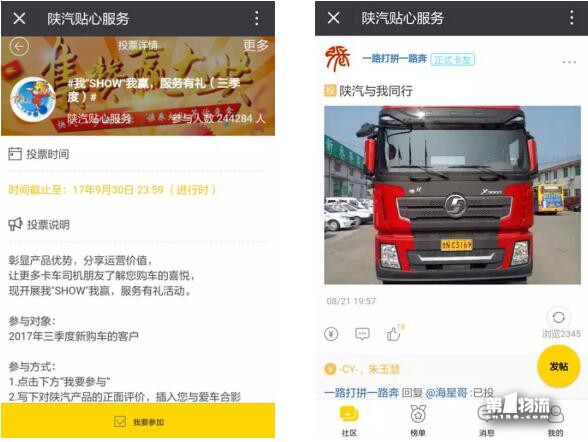 社区的每一步努力,得到了广大卡车司机最大的信任和最好的回应。通过精准的服务信息投放和丰富的互动活动【我SHOW我赢,服务有礼】设计,卡友在社区中可以畅所欲言,不分时间,不分地域,想知道的东西,总能在这里找到答案,尤其是针对一些不能用语言描述的故障,利用社区平台,拍照片、发小视频,更加直观,便于陕汽总部专家精准判断,快速提升售后服务效率,客户满意度稳步提升。