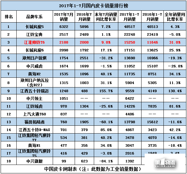 据数据统计,1-7月份全国15家主流与非主流皮卡车企销售总计221123辆,同比增长13.3%。其中保持超高速发展的江淮帅铃T6皮卡持续热销,并首次进入行业总销量榜前三甲,成为新任季军。截至7月底,帅铃T6皮卡销售达15250台,同比猛增31%。此前,国产皮卡的销量已经连续六个月呈现正增长趋势,随着下半年皮卡市场旺季的到来,2017年极有可能成为近年来皮卡市场表现最好的年份。