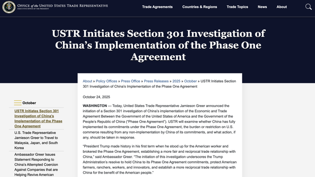 2025年10月24日,美国贸易代表办公室公告,对中国履行中美2020年签署《中华人民共和国政府和美利坚合众国政府经济贸易协议》的情况启动301条款调查。