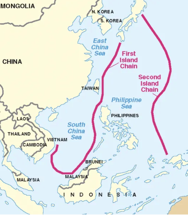 “第一岛链”(FIC)战略起源于冷战初期,当时美国策划者试图遏制前苏联和中国在亚洲的扩张,他们构想了一条连接东亚沿岸岛屿和群岛的链状网络,从千岛群岛和日本列岛,途经琉球群岛、中国台湾和菲律宾北部,一直延伸到婆罗洲。这条岛链构成了一道天然屏障,可以限制前苏联和中国海军力量向更广阔的太平洋地区的活动。