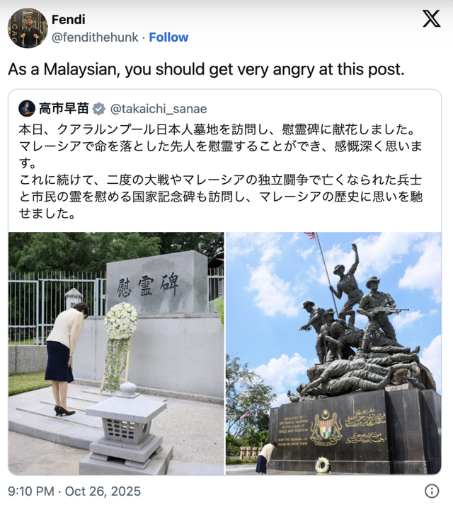 而作为民粹主义代表的高市早苗却在马来西亚祭拜了二战日军墓:10 月 25 日星期六,高市在社交媒体上发帖称,她前往吉隆坡的一处日本公墓,并在纪念碑前献花。