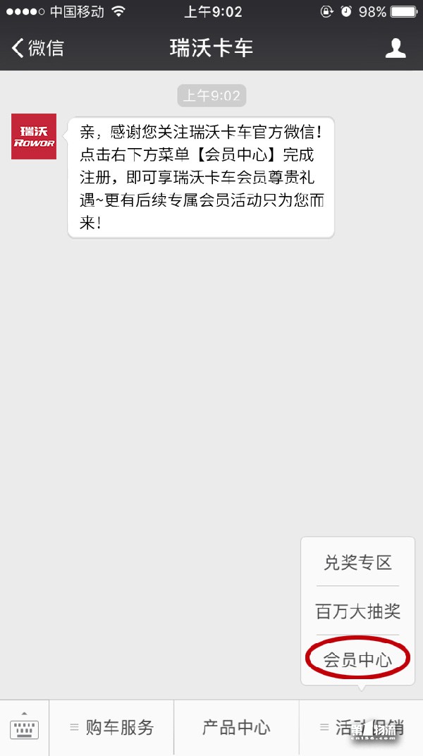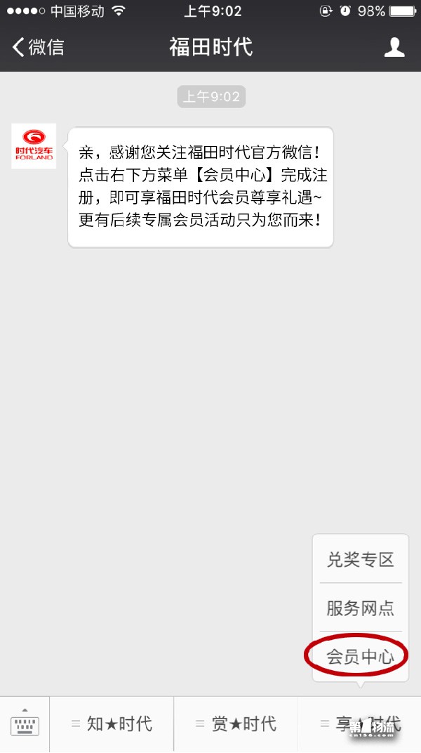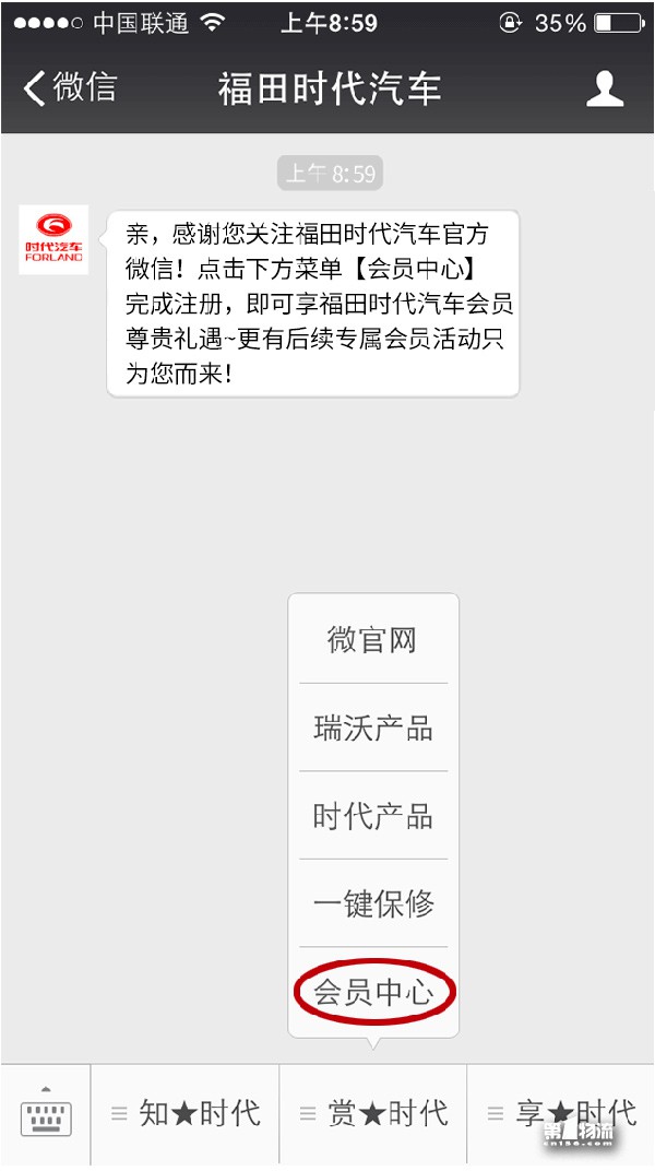 2.线上一键注册:关注“福田时代汽车”、“福田时代”、“瑞沃卡车”任意一个微信公众号,点击下方菜单【会员中心】完成注册。
