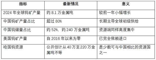 在中亚锁定大宗矿源:以哈萨克斯坦钨矿为代表,获取与中国规模相当但更“可控”的资源。
