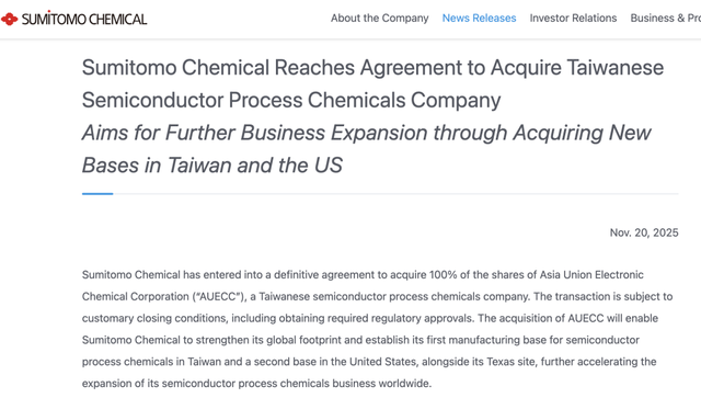 2025年11月20日,日本住友化学株式会社发文称,将收购中国台湾半导体工艺化学品公司亚洲联合电子化学股份有限公司(“AUECC”)100%的股份。