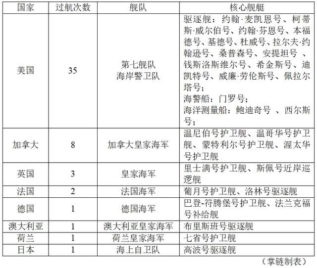 据掌链不完全统计,2021~2026年期间,美国舰艇35次、加拿大8次、英国3次、法国2次、德国1次、澳大利亚1次、日本1次、荷兰1次,从单舰穿越发展为联合穿越等多元模式,过航台湾海峡。
